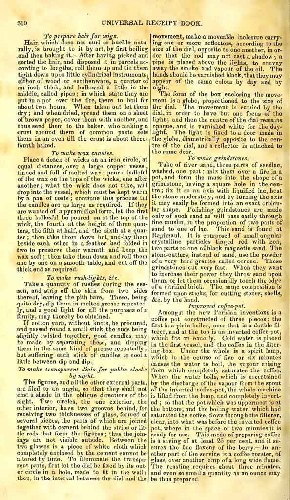 2. If you read this recipe, To prepare hair for wigs, you’ll note that it ends very…oddly…to say the least. I have the suspicion that somewhere in the compiling or typesetting the tail end of To prepare hair for wigs, was lost and the ending of some other article about baked goods was tacked on. As it stands, this To prepare hair for wigs recipe is a really weird set of instructions.