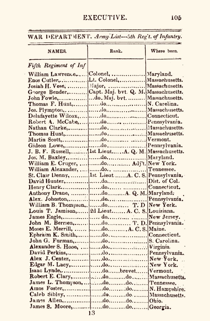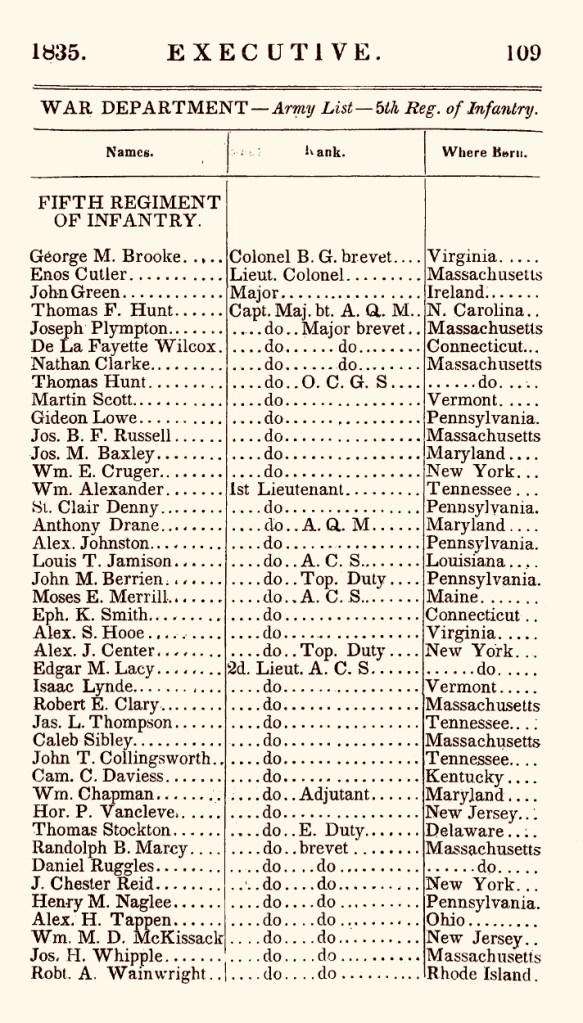 The 5th Regiment’s 1829 roster includes two men with the surname Clark: Captain (brevet Major) Nathan Clark(e), and 1st Lt. Henry Clark. Previously, we established that Capt.(later Major) Nathan Clark was not related to Jonathan M. Clark. First Lieutenant Henry Clark is new to me. I’ll have to investigate him further, but with a birthplace of Connecticut, chances are that he is not at all related to JMC. (One question to investigate: Is this 1st Lt. Henry Clark the inspiration for the name of Jonathan and Mary Clark’s only son, Henry M. Clark, born in 1843? Hmm…)