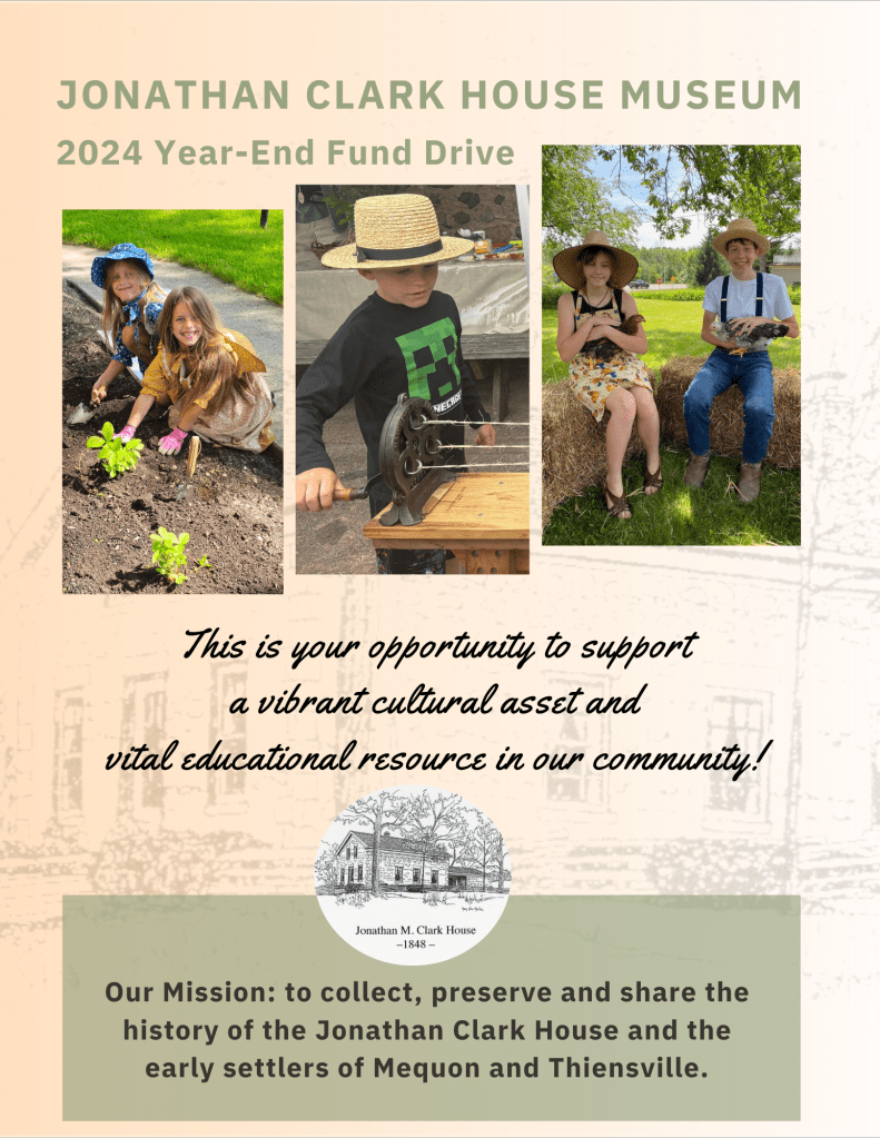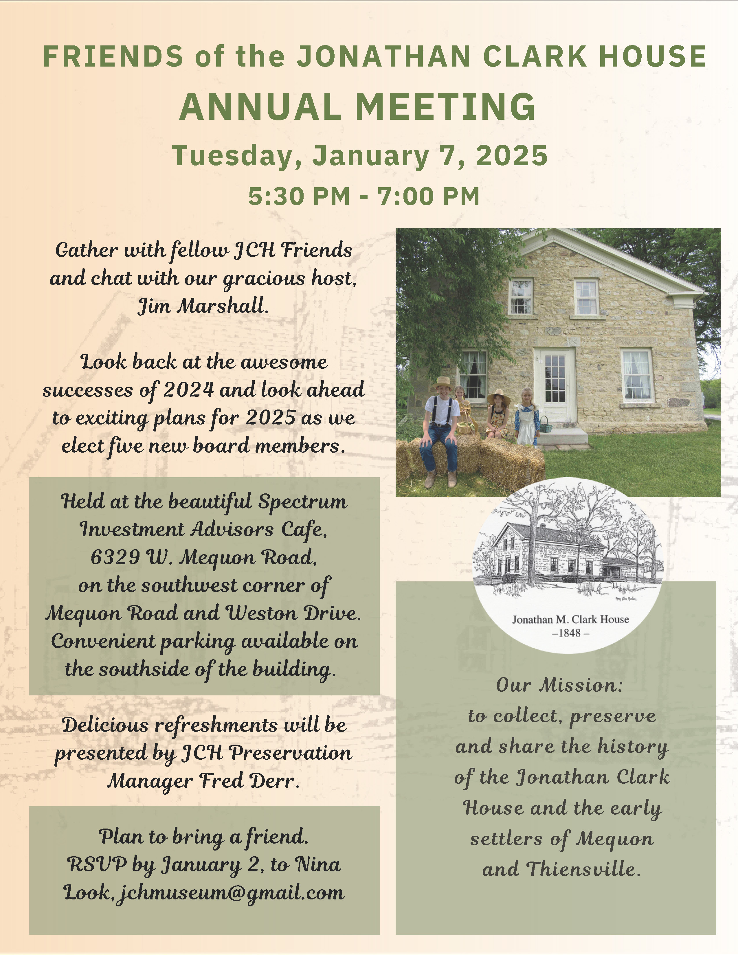 The Annual Meeting of the Friends of the Jonathan Clark House will be held on Tuesday, January 7, 2025, from 5:30-7:00. The meeting will be held at Spectrum Investment Advisors Cafe, 6329 W. Mequon Road, at the corner of Mequon Road and Weston Drive in Mequon. Free parking is available on the south side of the building.