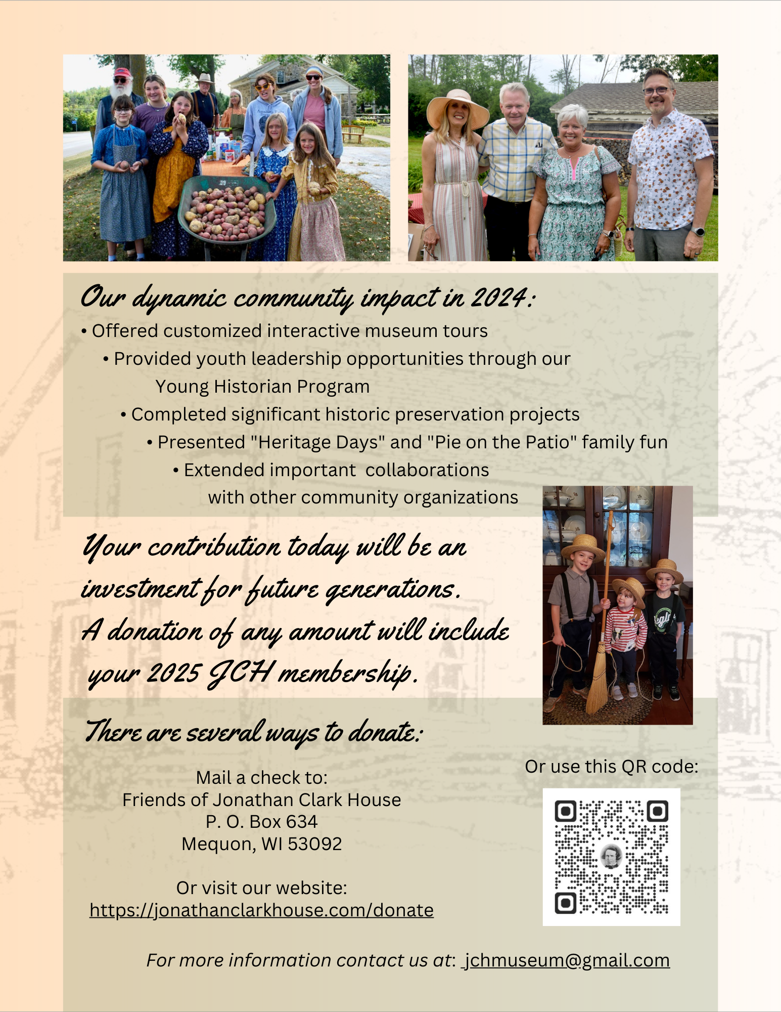 It’s still not too late to show your support for the Jonathan Clark House via the 2024 Year-End Fund Drive. If you’re feeling generous, please click over to our website’s DONATE page and follow the links to either donate online via our PayPal account, or by mail by downloading, printing and mailing our PDF form.