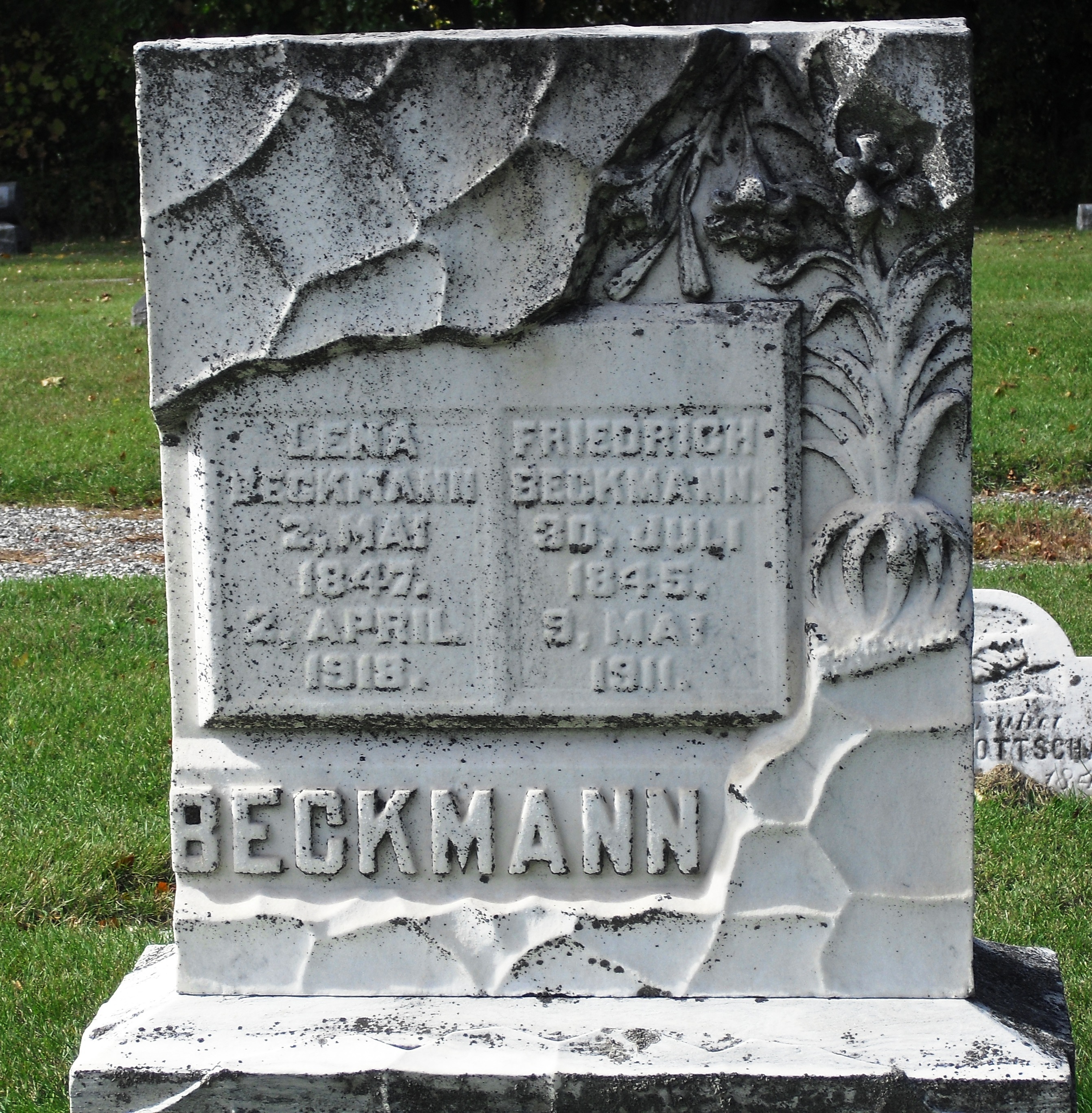 Beckmann, Lena and Fred, shared gravestone, Zur ruhe cemetery, Cedarburg, Ozaukee county, Wisconsin. Photo from the findagrave.com memorial for Friedrich Beckmann, used by permission of photographer, and findagrave contributor, Cheryl.