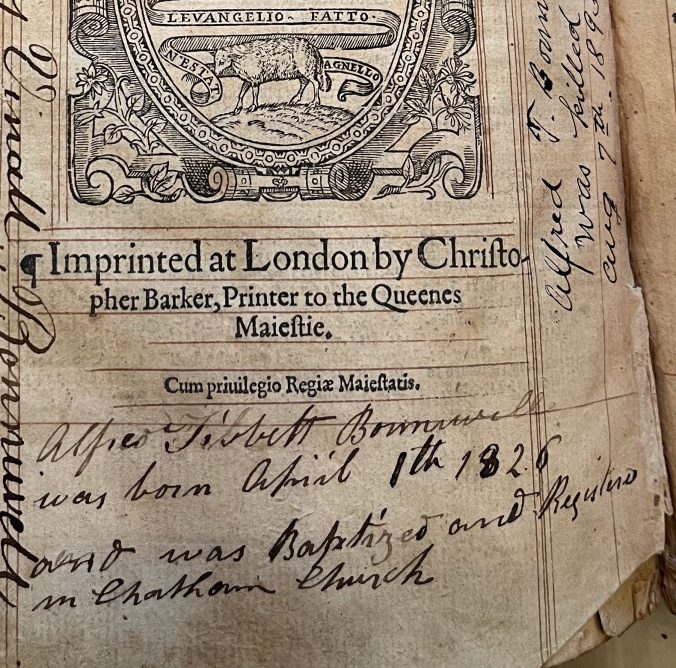 Above: Bonniwell Family Bible, end of second “Right Profitable… Concordance” showing part of Barker’s large printer’s device, followed by the manuscript record of the birth of Alfred Tibbett Bonniwell: Alfred Tibbett Bonniwell was born April 1th [sic] 1826 / and was Baptized and Registered in Chatham Church [Kent, England]