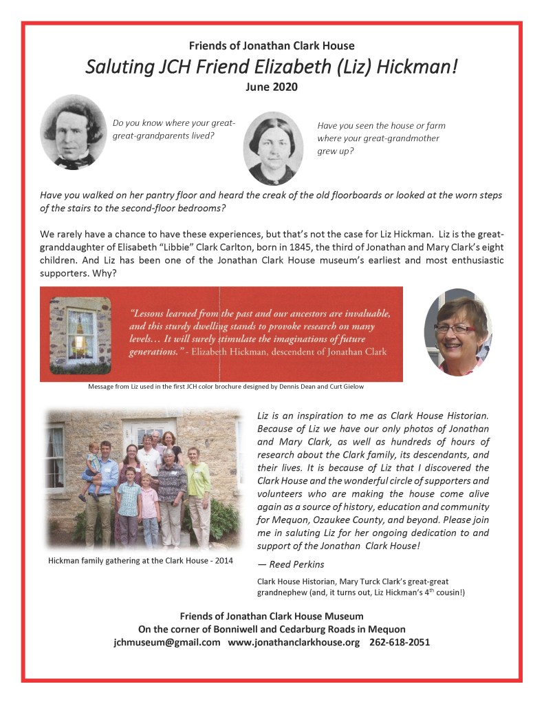 We all hoped that we’d have Liz in our lives for years to come, but it was not to be. I am privileged and grateful to have known her and to have pursued Clark and Turck genealogy with her for the past 13 years. Without Liz, I would not have found the Jonathan Clark House, and we would not have produced the subsequent research, images and documents that now enhance and promote the mission of the Jonathan Clark House Museum to “collect, preserve and share the history of the Jonathan Clark House and the early settlers of Mequon and Thiensville.”