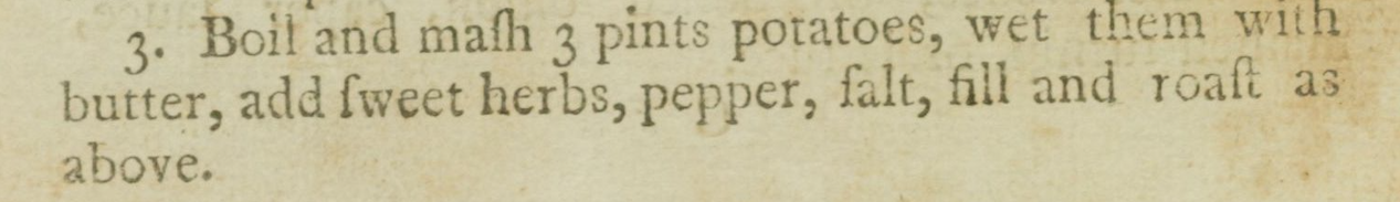 You’ll need to Boil and mash 3 pints potatoes, wet them with butter, add sweet herbs, pepper, salt, fill and roast as above,5 and so on.
