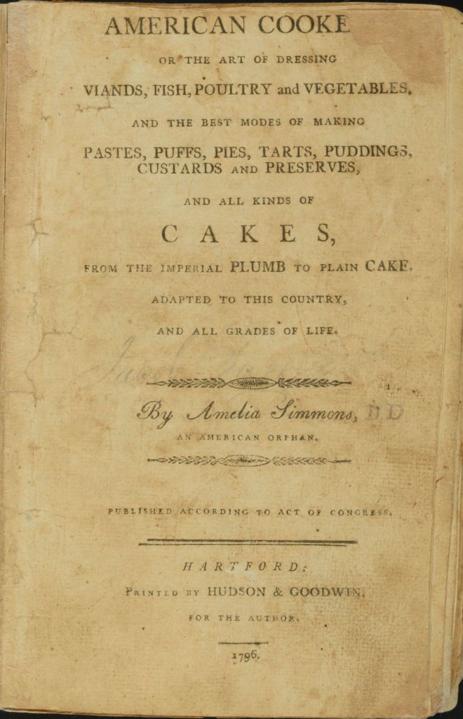 Yes, that’s American cookery, or, The art of dressing viands, fish, poultry, and vegetables : and the best modes of making pastes, puffs, pies, tarts, puddings, custards, and preserves : and all kinds of cakes, from the imperial plumb to plain cake, adapted to this country, and all grades of life, written by Amelia Simmons, “an American Orphan,” and published in Hartford by Hudson & Goodwin, for the author, in 1796.