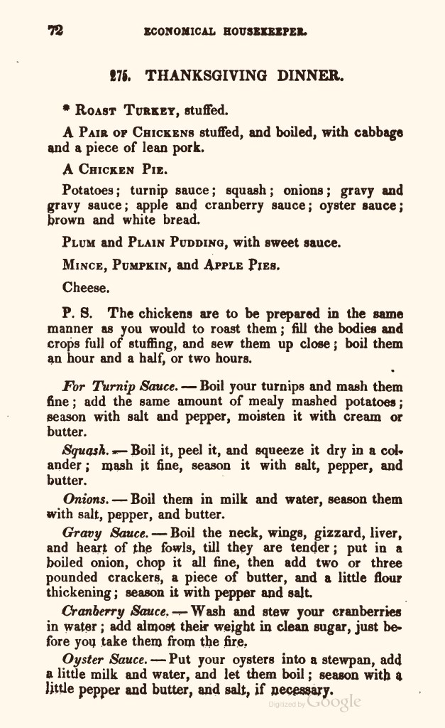 Here is a suggested menu for Thanksgiving dinner, as found on page 72 of Mrs. Esther Allen Howland’s invaluable New England Economical Housekeeper and Family Receipt [Recipe] Book, published in Worcester, Massachusetts, in 1845: