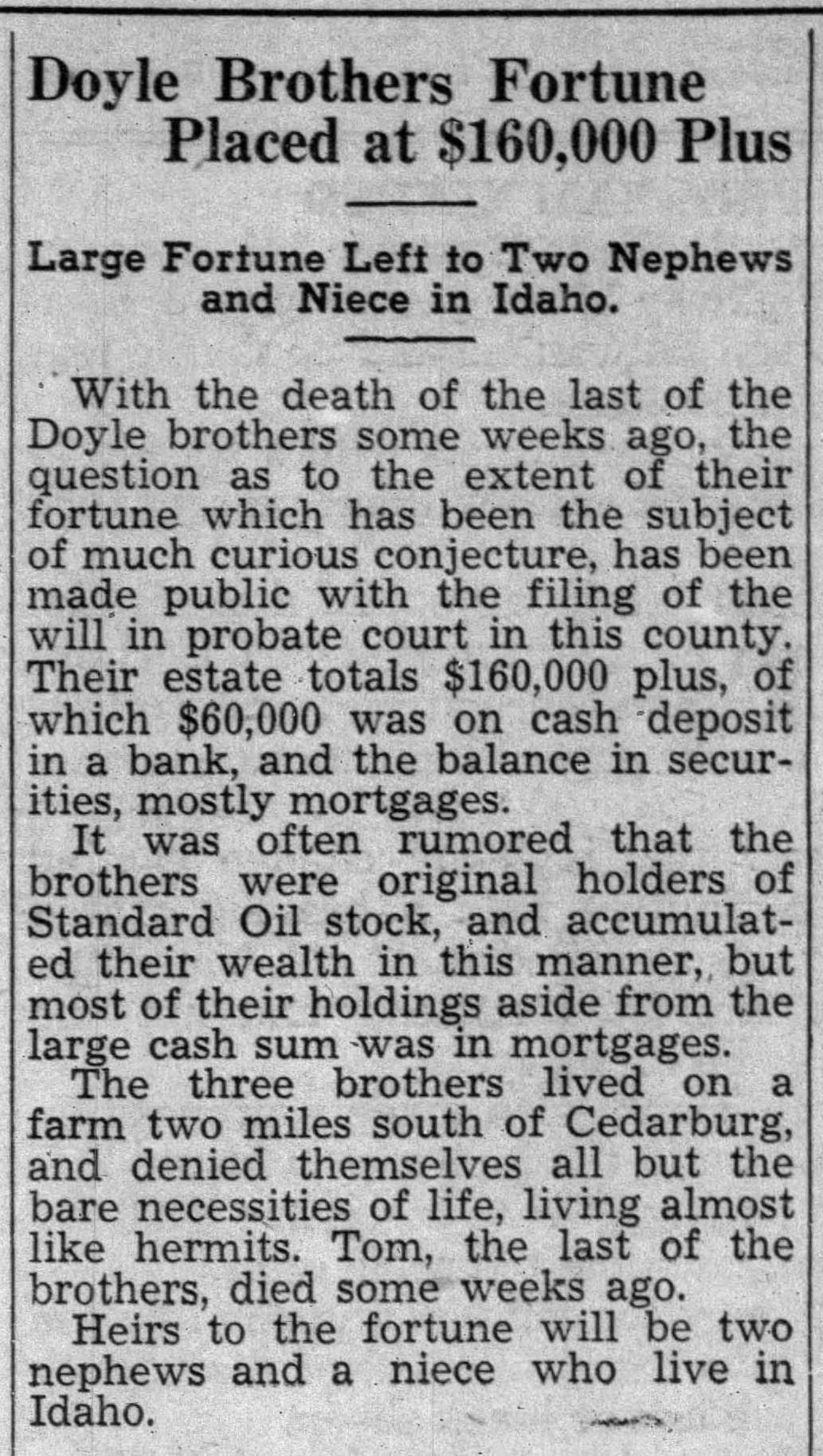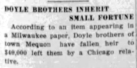 “Doyle Brother Inherit Small Fortune,” Cedarburg News 3 Oct 1923 p 1