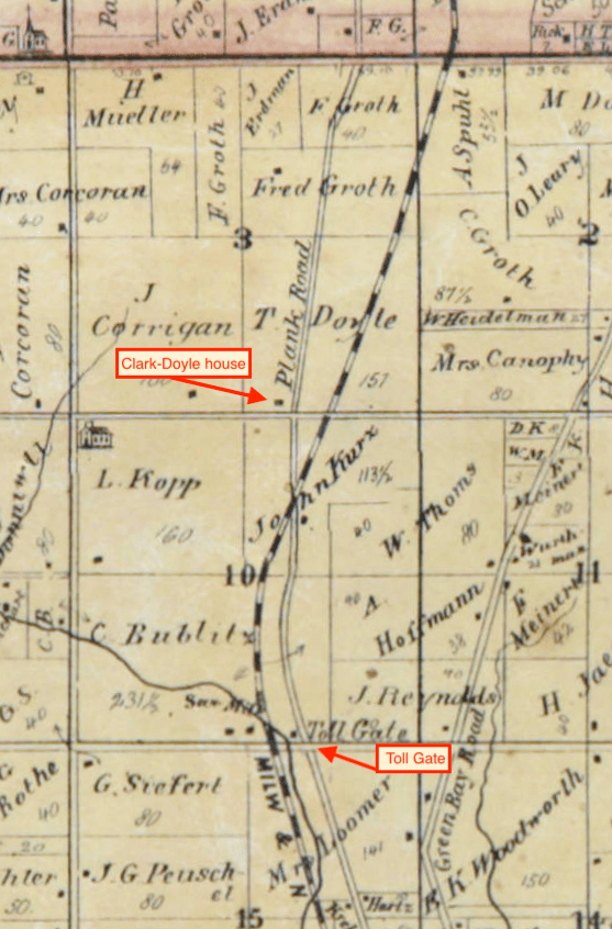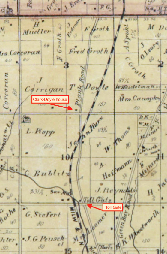 It’s not impossible that there was a toll-gate for the Cedarburg Plank Road at the Clark-Doyle house, but while this detail (below) of the 1872 Map of Washington and Ozaukee Counties, Wisconsin, 1873-74, shows the house in its correct location in section 3, on the northwest corner of modern Cedarburg and Bonniwell roads, it does not show a toll gate nearby. The only nearby toll gate for the Plank Road was located about a mile south of the Clark house, on the section 10 property of C. Bublitz, near the intersection of modern Cedarburg and Highland roads.