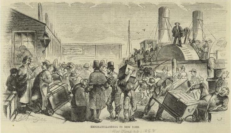 “Emigrant-landing in New York,” Harper’s weekly : a journal of civilization. (New York : Harper’ s Weekly Co., 1857-1916), June 26, 1858, NYPL Digital Collections.