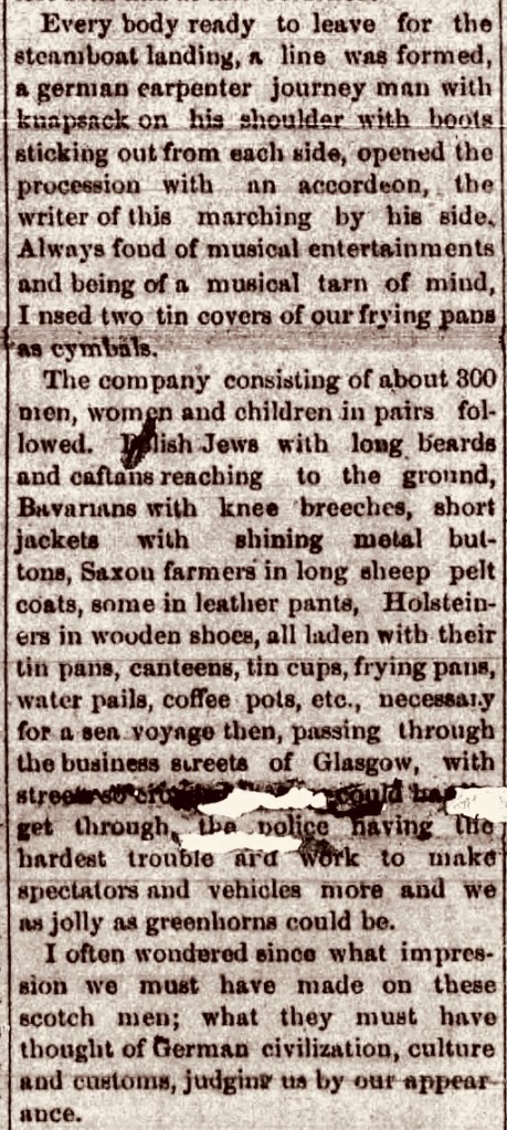 Our emigrant enjoyed his trip down the Clyde, comparing it favorably to the River Rhein (a serious compliment from a typical, proud, German), and describes his first encounter with Scottish bagpipes.