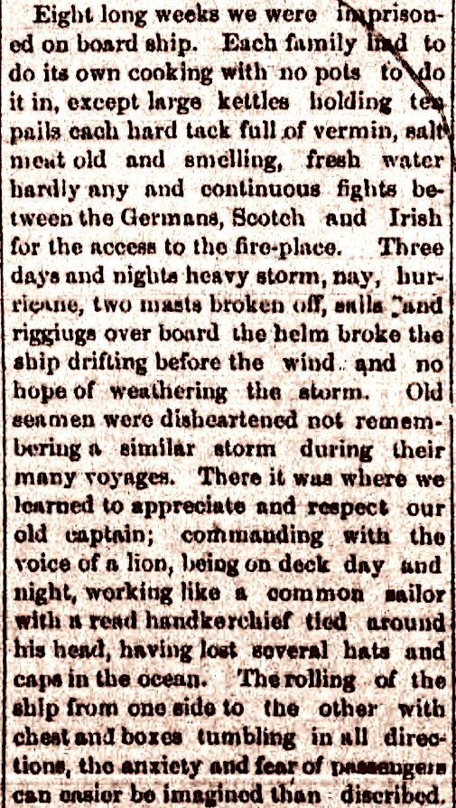 That concludes part one of our 1888 migration memories of the late 1840s. I hope you are enjoying this first-person tale of leaving the Old World for a new life in America. Any questions? Comments? Let me know.