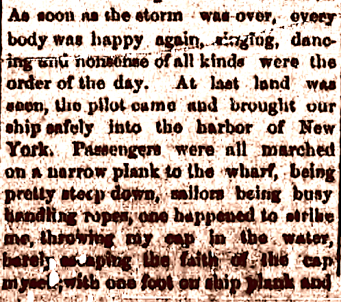 After the storm, the captain managed to regain control of the ship and complete the trip to New York harbor, much to the relief of the emigrants. Once arrived at New York, the passengers disembarked by walking a narrow plank between ship and wharf. In the process, our young narrator lost his new cap, and almost fell into the water, much to his mother’s displeasure.