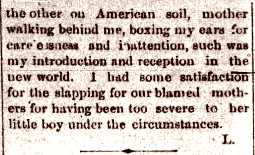 “Letters” like these were a common approach to sharing news and personal stories (and filling column-inches) in 19th-century newspapers. Sometimes such articles would be signed with the author’s full name. Other times, such letters would close with a pseudonym (especially when discussing controversial matters). Or, as was often the case, if the letter was “personal” in any way, the Victorian-era author would preserve his or her modesty by signing correspondence with just an initial or two.