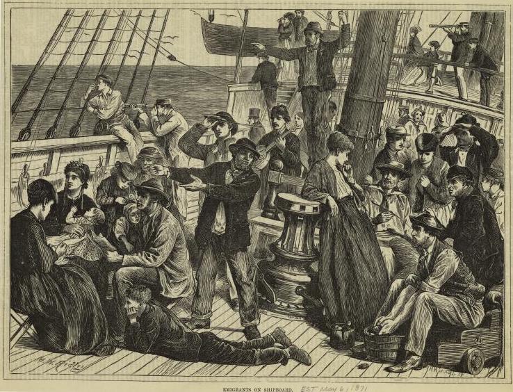 Emigrants on Shipboard,” from “Every Saturday.” (Boston [etc.] Houghton [etc.] 1866-), May 6, 1871. NYPL Digital Collections.