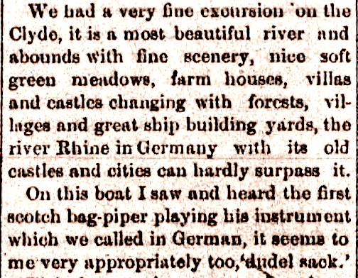 Our emigrant enjoyed his trip down the Clyde, comparing it favorably to the River Rhein (a serious compliment from a typical, proud, German), and describes his first encounter with Scottish bagpipes.