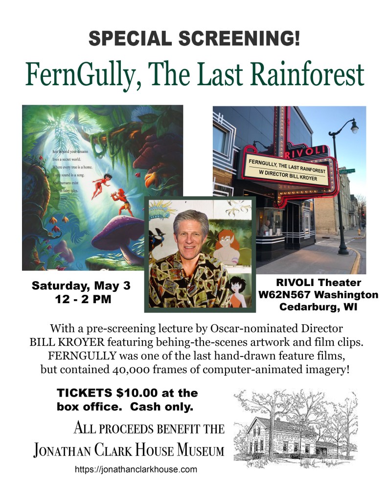 The Jonathan Clark House is excited to announce a special screening of  FernGully, the Last Rainforest. on Saturday, May 3rd, 12:00-2:00 p.m., at the historic Rivoli Theater, W62N567 Washington Avenue in downtown Cedarburg.