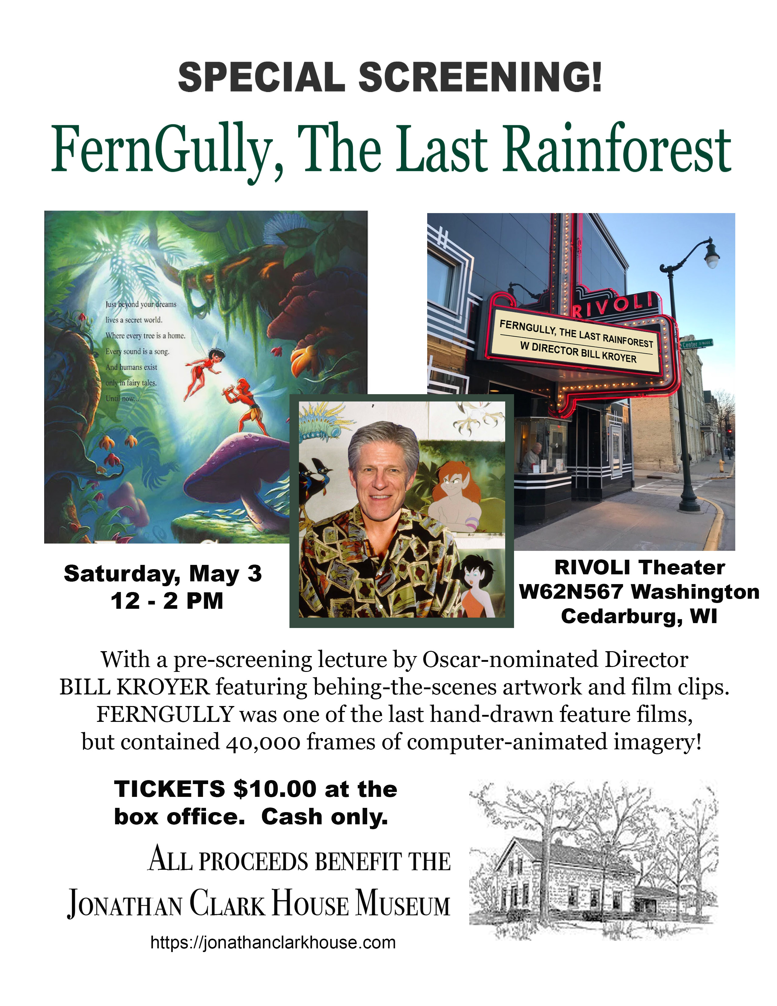 Join us! this Saturday, May 3rd, 12:00-2:00 p.m., for a special screening of  FernGully, the Last Rainforest at the historic Rivoli Theater, W62N567 Washington Avenue in downtown Cedarburg . All proceeds to benefit the Jonathan Clark House Museum.