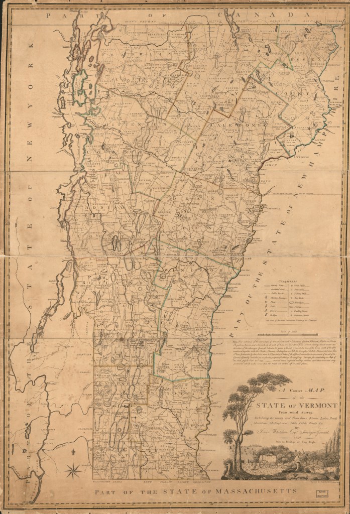 Today’s map was published in 1796, five years after Vermont’s admission to the Union, and four years after one Josiah Sawyer organized the gathering of would-be land purchasing “associates” in Rutland, Vermont, on April 3rd, 1792, at which time the initial petition for the prayed-for township of Stanstead was signed. Many, perhaps most, of the petition signers were Vermonters. Let’s look at our map and see what we can discover about Vermont—and its relationship to Lower Canada settlement—in those early years.