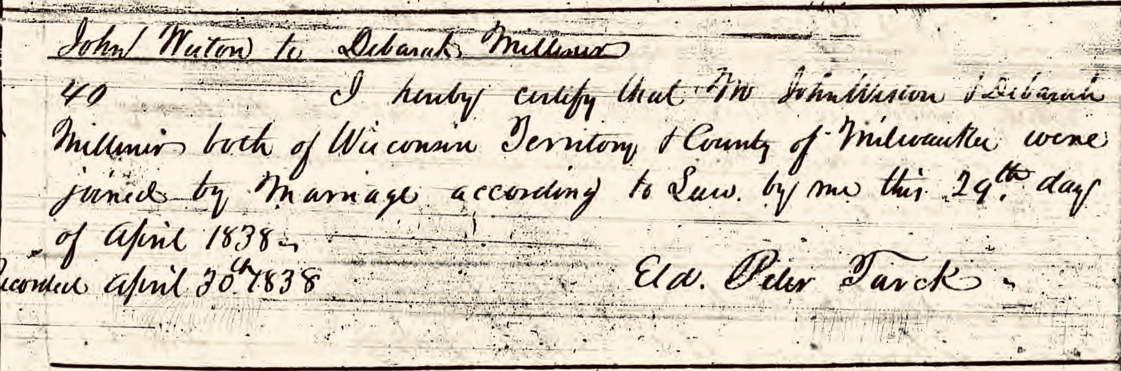 Fun fact: Mary (Turck) Clark’s father, (Baptist) “Elder” Peter Turck, was the officiant at the Weston-Milliner wedding in 1838. It was the fortieth marriage recorded in the first volume of marriage records for Milwaukee county (and its still-attached for judicial purposes neighbor counties, including old Washington/Ozaukee county).2