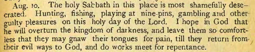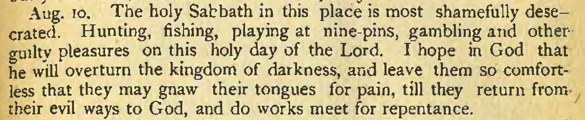 Aug. 10. The holy Sabbath in this place is most shamefully desecrated. Hunting, fishing, playing at nine-pins, gambling and other guilty pleasures on this holy day of the Lord. I hope in God that he will overturn the kingdom of darkness, and leave them so comfortless that they may gnaw their tongues for pain, till they return from- their evil ways to God, and do works meet for repentance.