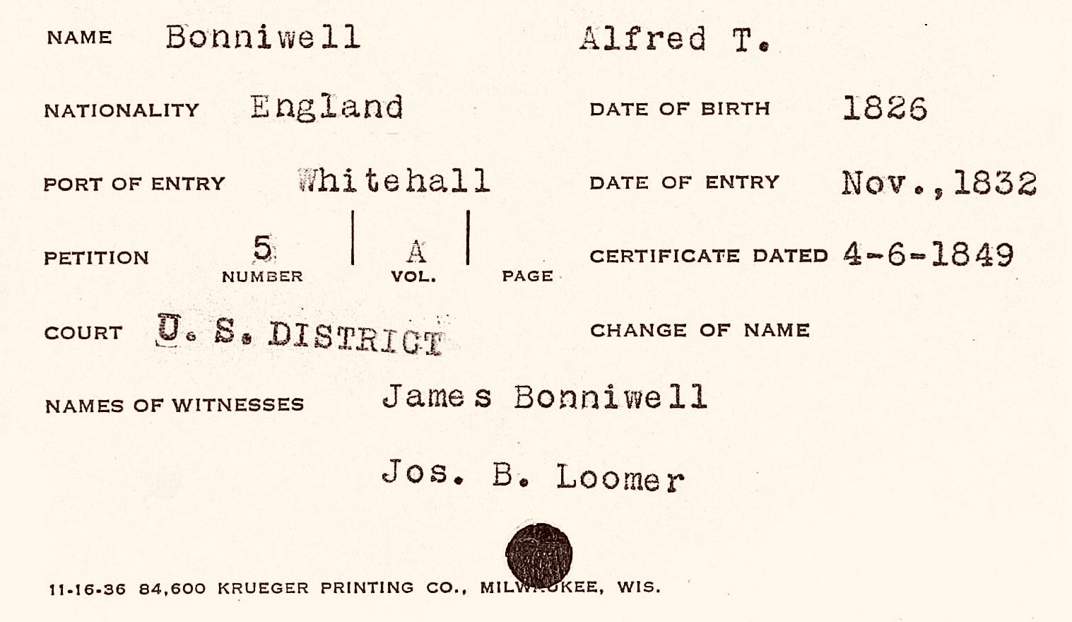 Today’s post in our Bonniwell document series1 focuses on one important item, Alfred T. Bonniwell’s Petition for Naturalization as a United States citizen, completed in Milwaukee, at the U.S. District Court for the District of Wisconsin, November 6, 1849.