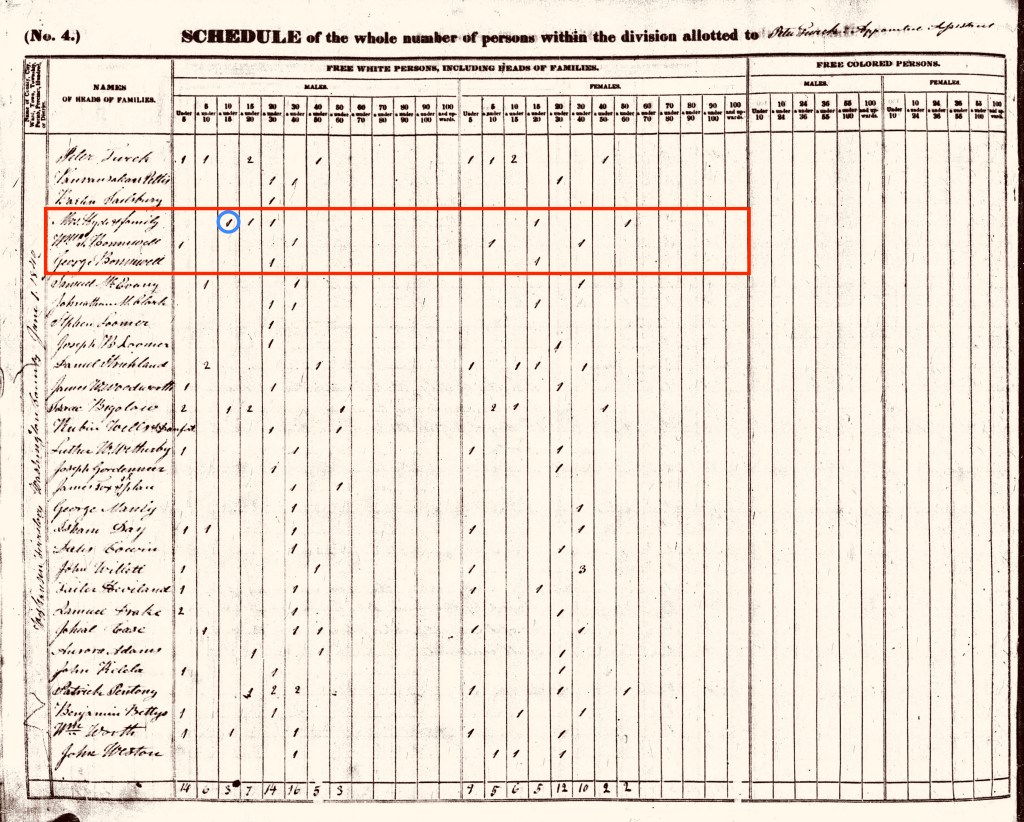 Ancestry.com. 1840 United States Federal Census [database on-line], Washington, Wisconsin Territory; Roll: 580; Page: 123; Hyde and Bonniwell households; Family History Library Film: 0034498. Image annotated, lightly tinted, and cropped. Click to open larger image in new window.