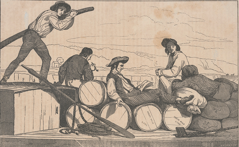 Anderson, Alexander, engraver. Five Men on a Flatboat With Barrels and Sacks; One Man Operates the Keel from Above the Boathouse, the Others Are Resting on the Freight, circa 1830-1860, Library of Congress.