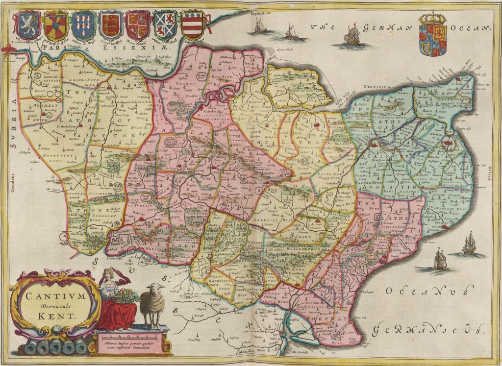 This 1665 map, titled Cantivm Vernacule Kent [Cantium, in the vernacular, Kent], is part of a much larger work, Joan Blaeu’s magnificent Atlas Maior Sive Cosmographia Blaviana, published in Amsterdam between 1662-1672. This is another amazing map made available online by the David Rumsey Map Collection, whose staff provided this commentary: