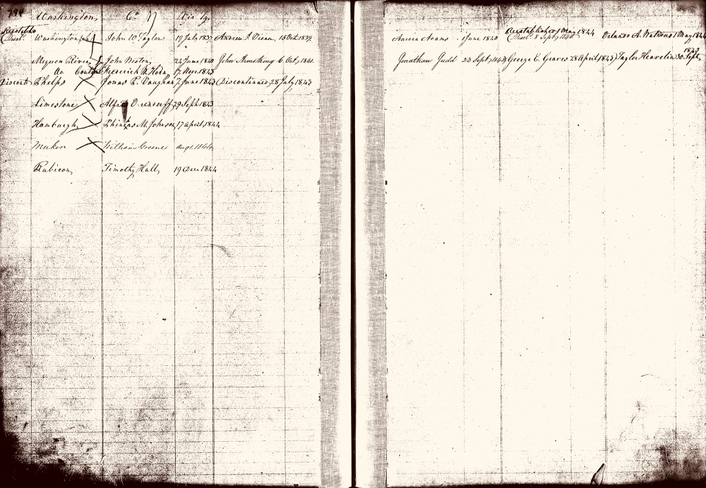 Let’s get our bearings by making an accurate list of the county’s first postmasters and their terms of office. Our source is from the National Archives in Washington, DC, the Record of Appointment of Postmasters, 1832-Sept. 30, 1971; Records of the Post Office Department; Record Group Number: 28; Series: M841; Roll Number: 144. County: Polk – Wood, Vol. 12B, circa 1832-1844, pages 794-795, currently available via Ancestry.com as U.S., Appointments of U. S. Postmasters, 1832-1971 [database on-line], 2010, image 428 of 583 (accessed 18 Jan 2024). Here’s the microfilmed image of the two-page ledger recording Washington county’s first post offices and postmasters, slightly retouched to make for easier reading: