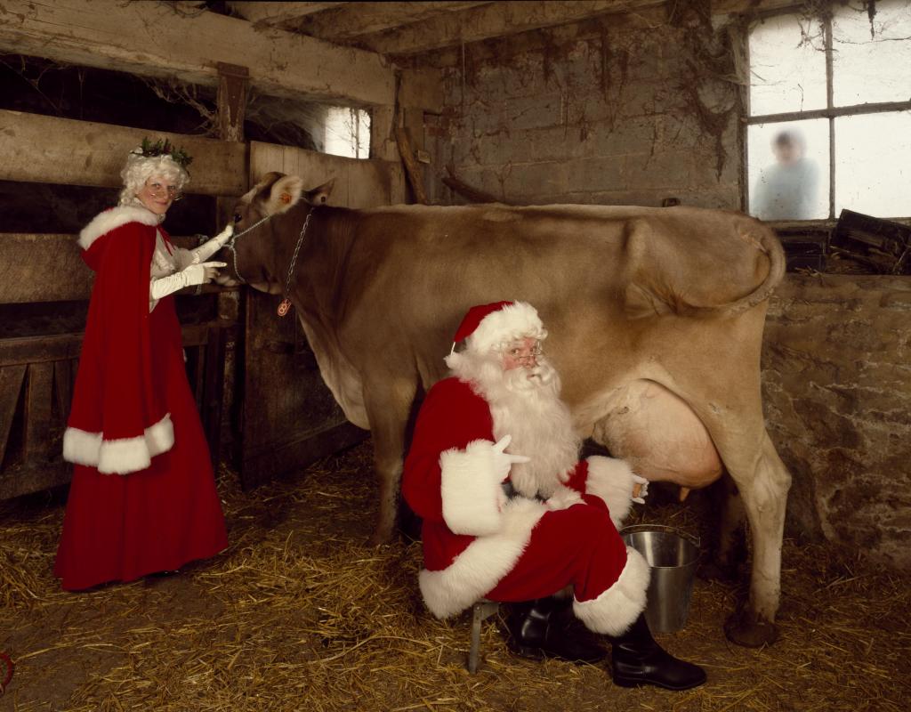 Highsmith, Carol M, photographer, “Santa and Mrs. Claus milk a cow. Why, we’re not exactly sure.” c. 1980-2010. Library of Congress